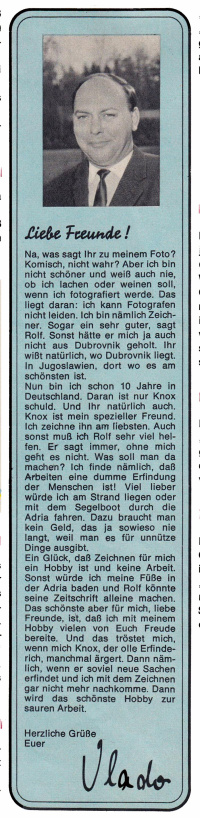 Liebe Freunde! von Vlado Magdic; Witze S.2 Werbung: Europa LP Hörspiele (DM 5,00) S.14 Ich weiß mehr: Uhu (169-172) S.15-18 Werbung für Tip Top 50 S.27 Werbung: Tacho-Willi unterwegs (VDO Tachometer Werke) S.27 Werbung: MÄRKLIN das System der vielen Vorteile S.27 Poster: Knox ("Da war bestimmt Lupo am Werk"), Teil 6/6 (Z: Magdic) S.28 Die große Schmuckbildwahl; Abo-Schein für FF und Tip Top; Vorschaubild FF 573 S.29 Werbung: Unifil, Stoeckel & Co., Freilassing S.29 "Und was meinst DU?" (Leserbriefe) S.30 Werbung: Fleischmann HO Modell Angfangsgarnitur 1010 S.30 Werbung: Marken Paul, Freilassing S.30 Werbung: Fahrräder ab DM 2,- Hans W.Müller S.30 Schreiben bringt Freunde; Impressum S.31 Werbung: "Saxi", Torpedo Dreigangrad (Firma Sachs) S.31 Werbung: Wrangler Jeans S.31