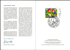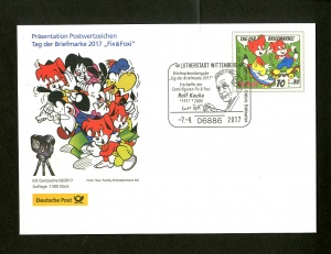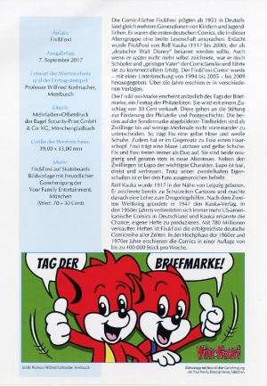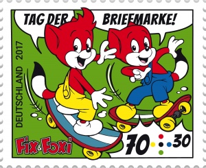 Sondermarke "Fix & Foxi" zum Wert von 70 + 30 Cent. Als "Plusmarke" unterstützt sie finanziell die Stiftung zur Förderung der Philatelie und Postgeschichte. Mit dem Thema "Fix & Foxi" wurde der berühmtesten Schöpfung von Rolf Kauka gedacht, der 2017 100 Jahre alt geworden wäre. Was es neben den Marken sonst noch gab, zeigt unsere Bildergalerie (Anklicken vergrößert).